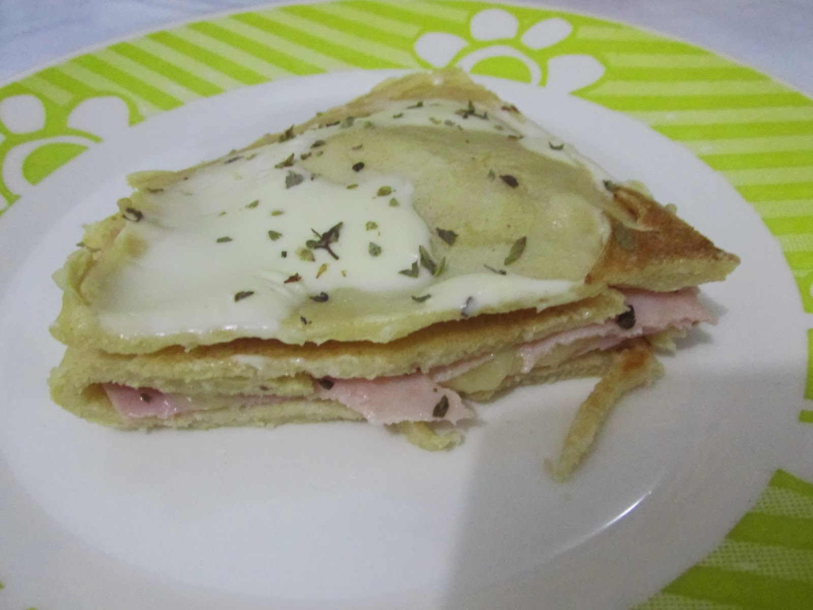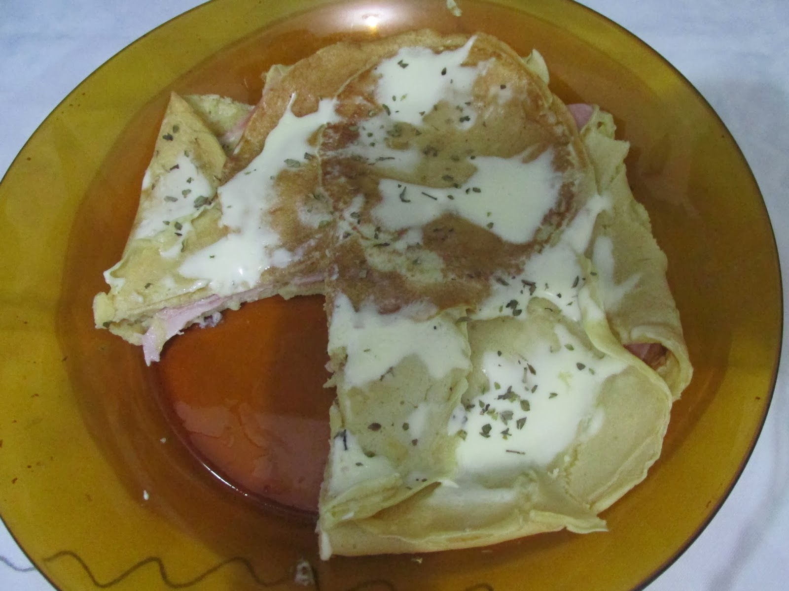 Em uma frigideira antiaderente coloque uma concha dessa massa , frite as panquecas uma a uma , em uma travessa arrume as panquecas , coloque uma camada de presunto outra de muçarela e outra de peito de peru/frango, coloque um pouco de orégano , cubra com o restante das panquecas e em cima espalhe o requeijão e mais um pouco de orégano leve ao forno por 15 min em forno médio e sirva quente